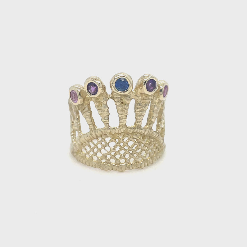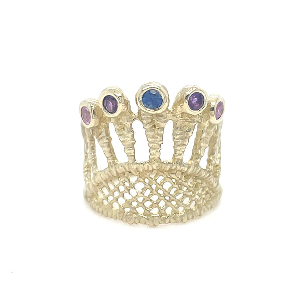 Art Deco inspired lace ring with a peacock tail pattern. 9k gold. The ring is set with 2 pink sapphires, 1 blue sapphire and 2 amethysts. Stones are 2.5mm diameter.🩷💜💙