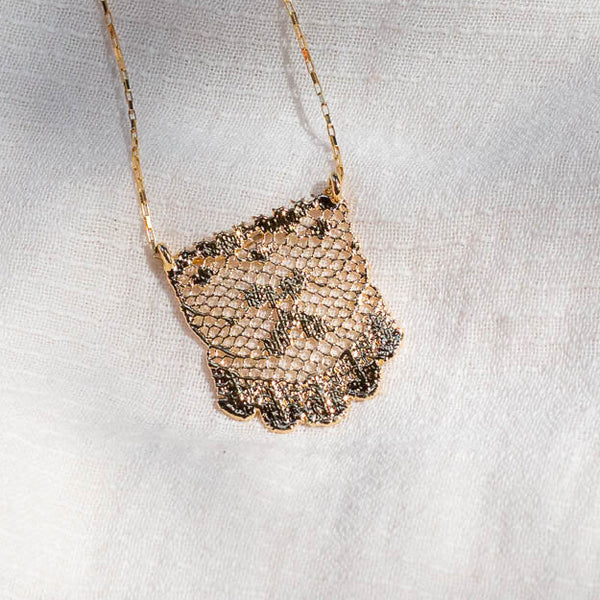 Cast out of a vintage lace trim from France, the flag shaped Nassau medallion necklace is made in sterling silver plated with 5 microns gold (vermeil), gold filled chain, or all sterling silver.